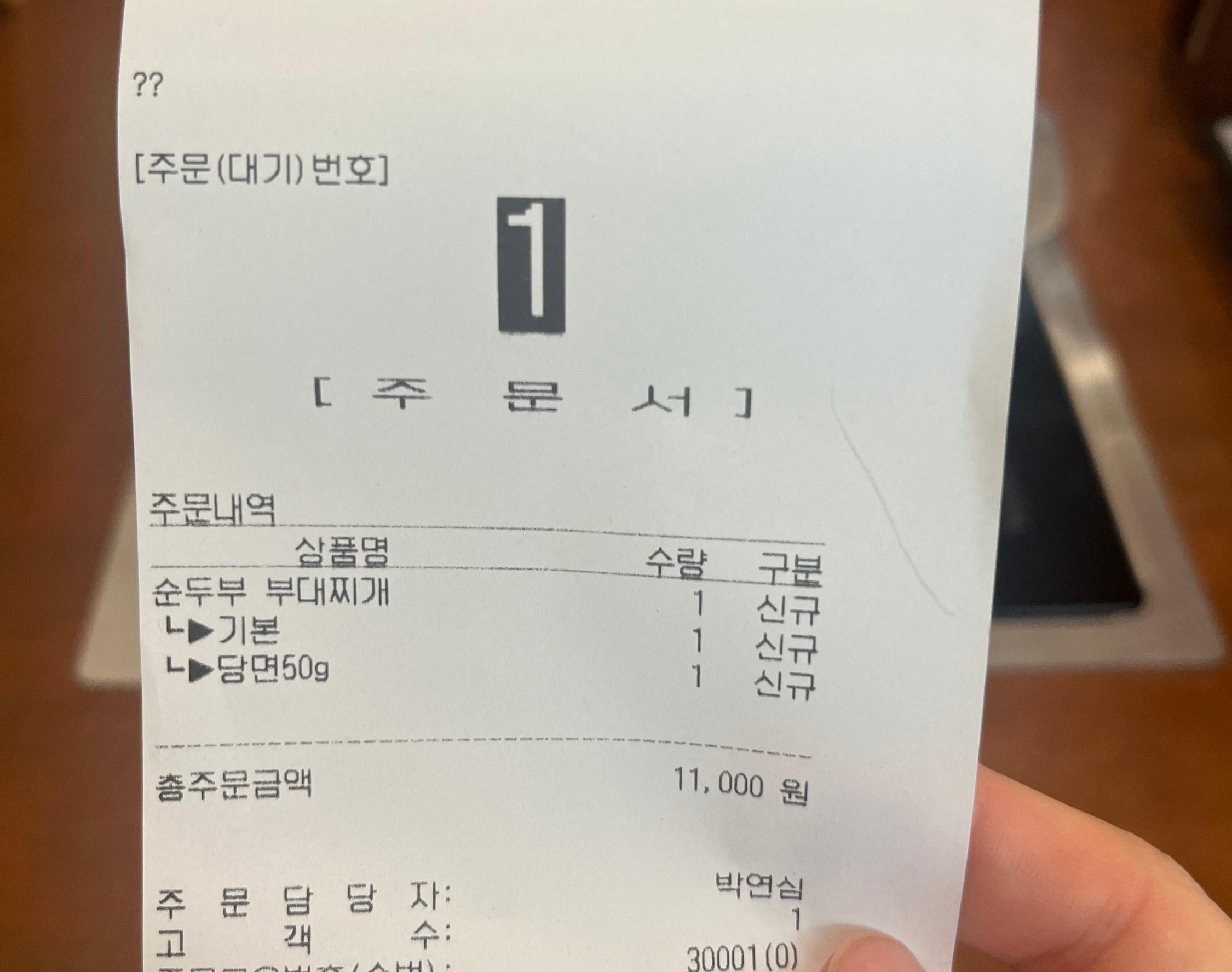 내가 주문한 순두부 부대찌개 11000원, 찌개는 평소 2인분 이상주문 가능인데, 여긴 1인분씩도 파니, 혼밥하기 너무 좋다.